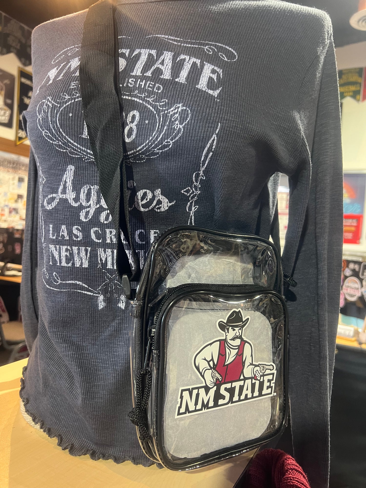 NM State Pistol Pete Clear Crossbody Purse is backordered and will ship as soon as it is back in stock.